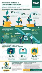 L’Indice des dettes à la consommation de MNP permet de prendre le pouls des Canadiens à l’égard de leur endettement, en plus de mesurer leur capacité à payer leurs factures et à faire face aux imprévus et aux hausses de taux d’intérêt sans risquer l’insolvabilité. Réalisé par Ipsos et mis à jour chaque trimestre, cet indice est l’un des baromètres les plus fiables de la situation financière des Canadiens.